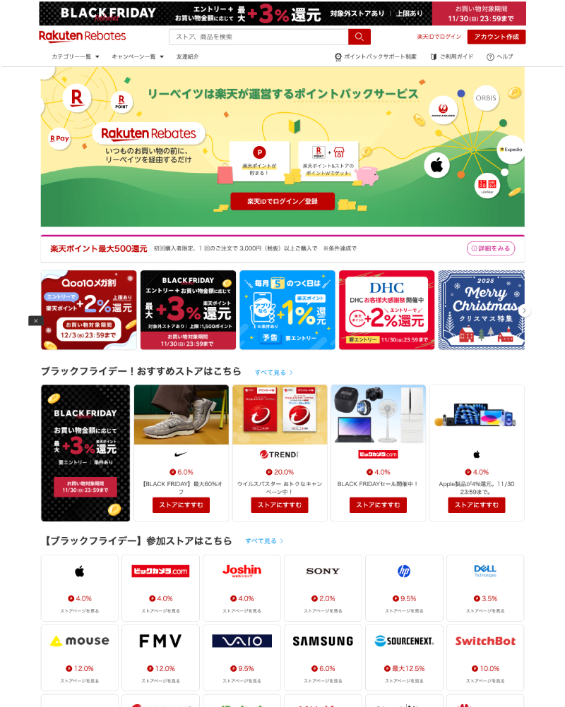 楽天リーベイツは、楽天が運営する高還元率ポイントバックサービスです。リーベイツを経由して提携ストアで買い物をすると、購入金額の一部が楽天ポイントとして還元されます。楽天市場とは異なり、ブランドの公式オンラインストアなどが多数参加しており、iHerbもその一つです。