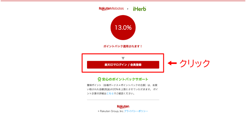 クリックすると、iHerbのストアページに遷移します。すると、楽天IDでのログインを求められます。同時に現在のポイントバック率(例:13.0%)が表示されます。