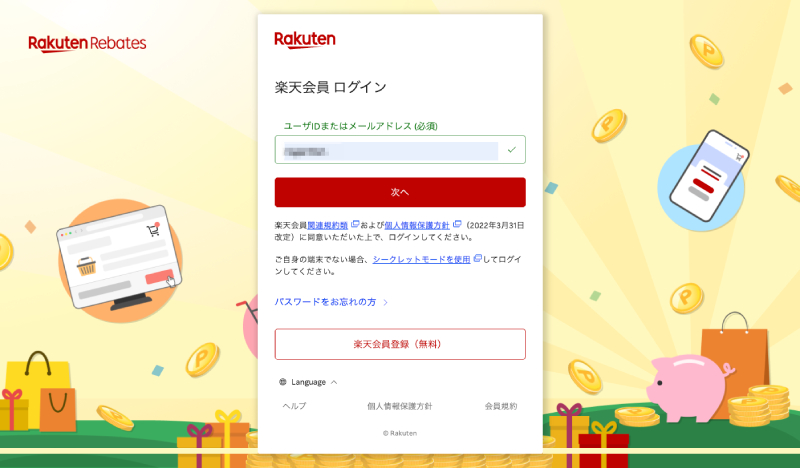 楽天IDでログインします。楽天会員でない場合は、この機会に会員登録を行います。