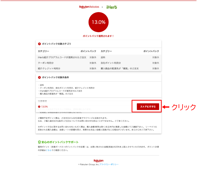 楽天IDでログインすると、下記の画面に遷移します。iHerbのストアページに表示されている現在のポイントバック率(例:13.0%)を確認し、「ストアにすすむ」ボタンをクリックします。ボタンをクリックしない場合も数秒後に自動的にiHerbの公式サイトへ遷移します。