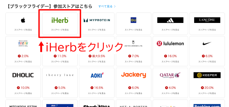 まず、楽天リーベイツのウェブサイトまたはアプリにアクセスし、「iHerb」を検索します。もしくは、参加ストア一覧より、「iHerb」を見つけて、クリックします。